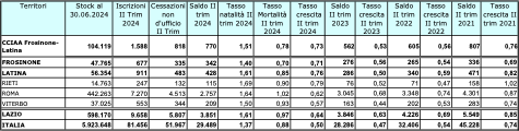 Nella provincia di Latina, da gennaio a giugno, ci sono state 1.940 iscrizioni e 1.468 cessazioni: +472 imprese sul territorio. Nella provincia di Frosinone, invece, 1.410 nascite e 1.233 scomparse: saldo a +177.