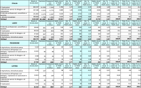 Nel Basso Lazio, invece, 105.056 imprese nel 2023 e 104.119 a metà 2024: meno di mille in meno. Frutto questo di oltre trecento new entry e quasi seicento cessazioni in meno. Nel 2023 le iscrizioni erano state in tutto 5.299 (+4.97%), mentre le chiusure 4.360 (+4.09%). Nei primi sei mesi del 2024, intanto, sono state rispettivamente 1.588 e 818.