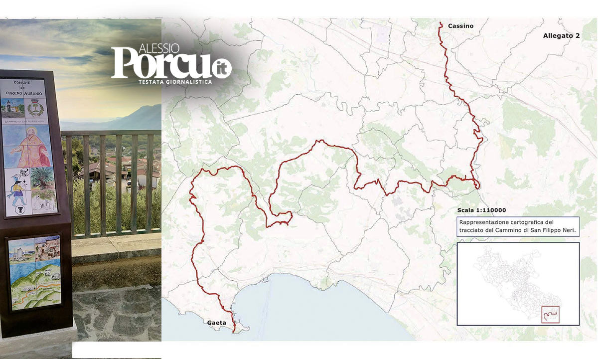 Il Cammino che rievoca il percorso spirituale compiuto da San Filippo Neri nel 1532, da Cassino fino alla Montagna Spaccata di Gaeta, si sviluppa per circa 120 chilometri, articolati in 7 tappe. Attraversa dieci Comuni del basso Lazio: Cassino, Sant’Ambrogio del Garigliano, Sant’Andrea del Garigliano, Vallemaio, Coreno Ausonio, Ausonia ed Esperia, nella provincia di Frosinone; Formia, Itri e Gaeta nella provincia di Latina.