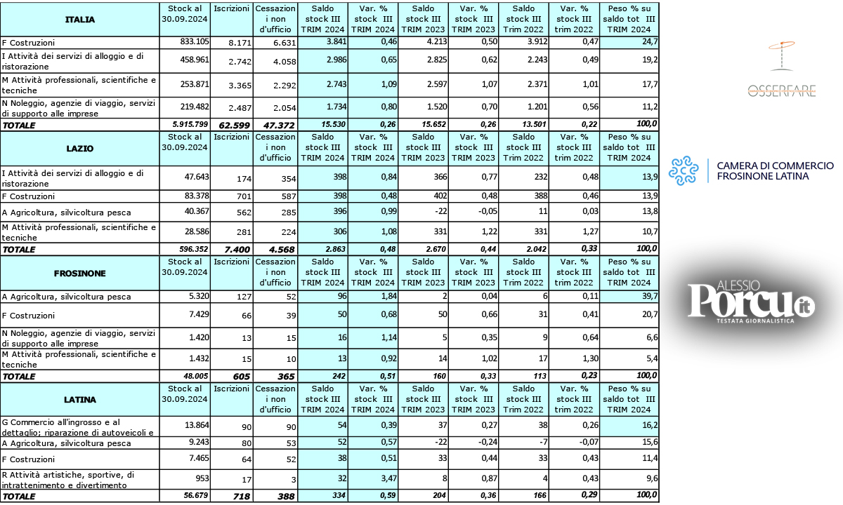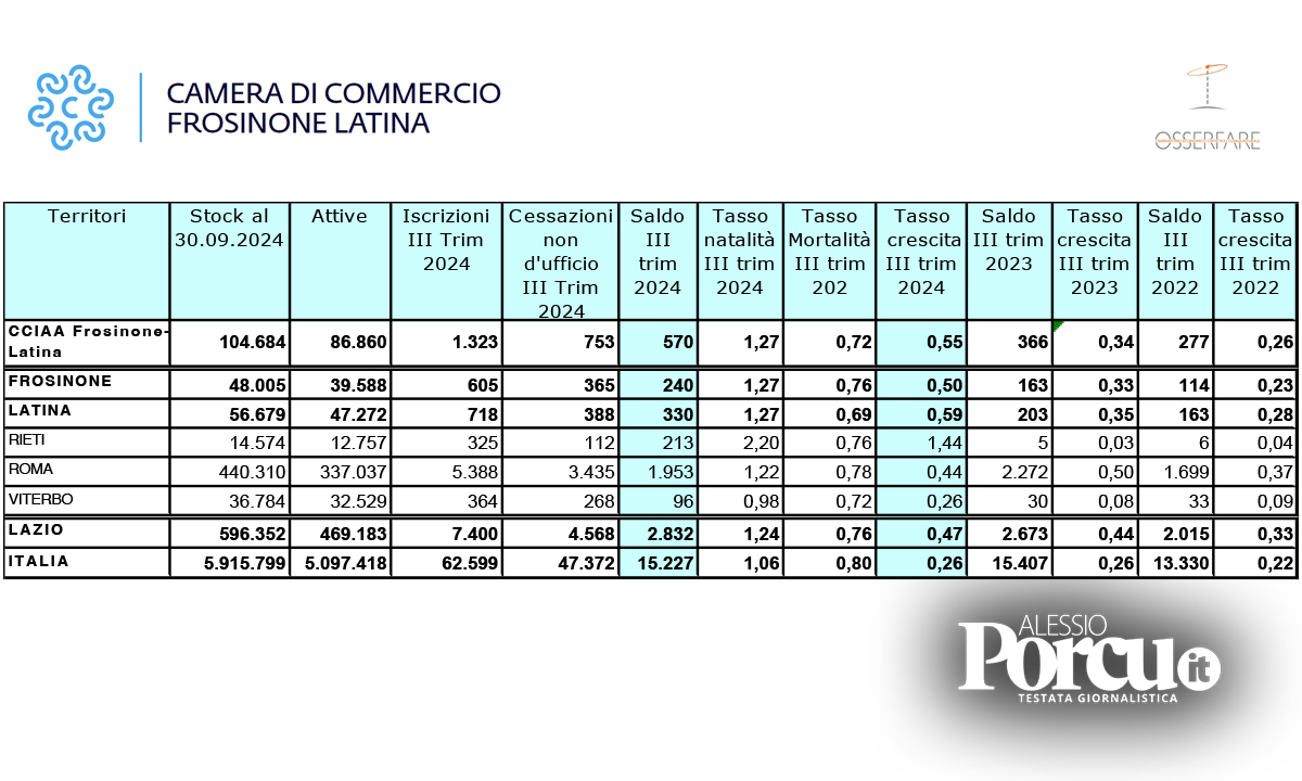 I segnali di ripresa continuano: le due province del Sud Lazio continuano a correre, ci sono imprese che chiudono ma sono più quelle che nascono. Il numero delle attività a Frosinone, Latina e Rieti cresce in una maniera così dinamica che i tre territori guidano la graduatoria nazionale delle province per tasso di crescita nel periodo luglio – agosto – settembre 2024.